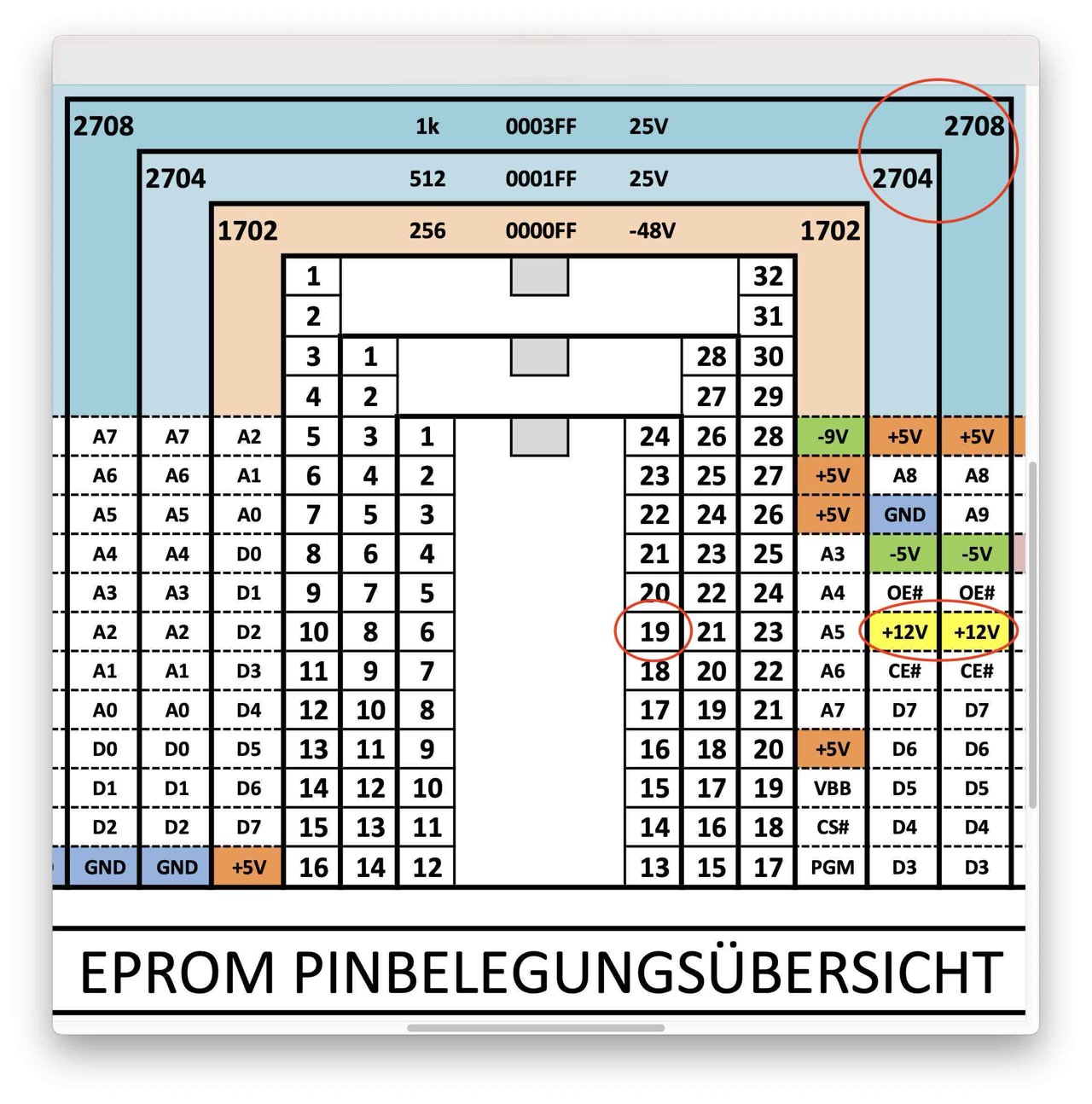 So far I did not find any 2704 EPROM for a reasonable price. On eBay these EPROMs were currently (Nov 2023) offered for $300 to 700/pcs and more! Crazy! But it does not matter, because the 2708 and 2704 are pin compatible - except for pin 21 (GND/A9), so just duplicate the 2704 ROM image and program it to a 2708.