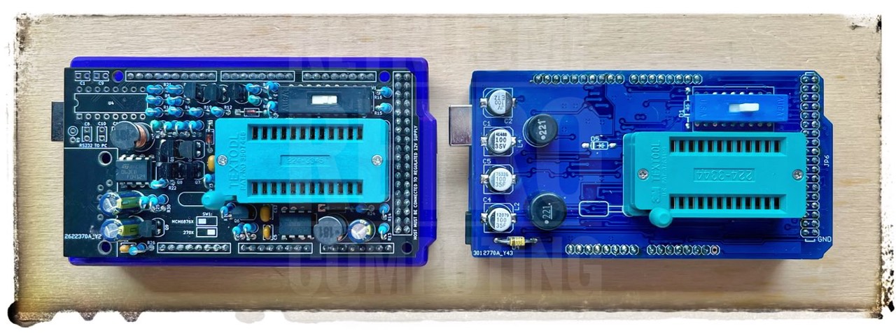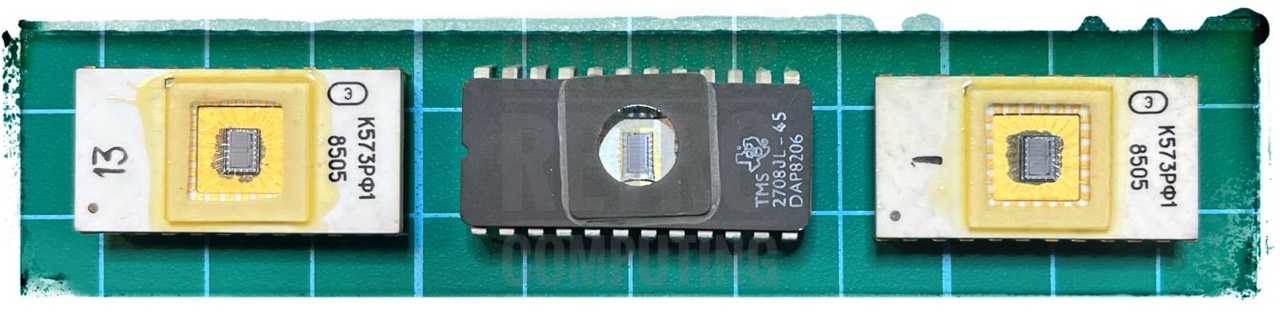 I have two HVEPROM programmers. Model 1 (left) is the original model, model 2 is an SMD version. Actually both should work the same, but they don't. With model 1 I can program the TMS and MM EPROMs, but not the K573РΦ1 and U555C. With model 2 it is the other way around, K573РΦ1/U555C yes, but TMS/MM no. I have no idea why this is the case. It may be the 25V programming voltage.