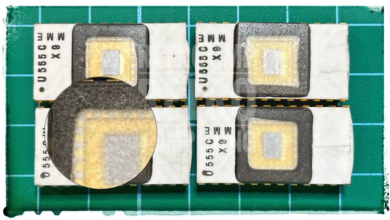 The following U555C EPROMs from the former GDR are characterised by the fact that they do not use the usual clear and transparent quartz glass for the erase window. It is very opaque and has a roughened surface. However, the EPROMs are erased perfectly in a UV eraser (Siemens Simatic 6ES5985-0AA11) from back then at 20 minutes.