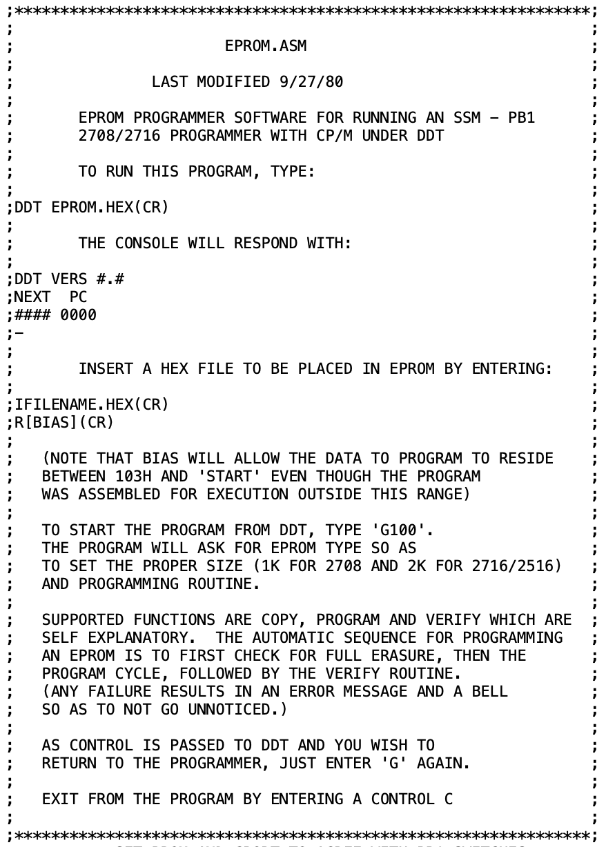 And here is a screendump. Have a look at lines 26, 27 and 36. Load the EPROM file as HEX and put it at address 0200. Start programming with G100. Why this works you can see at lines 56. Smart!