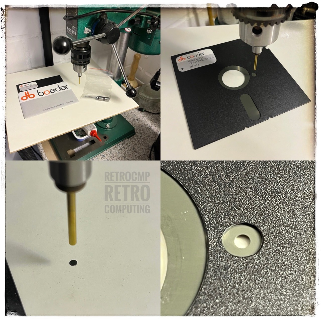 Now I use a drill press but without drill. Just lower and lightly punch until you hear the punching. Yes, you can hear it; don't press too much, with fingertip sensitivity. The holes will be absolutely perfect! Five minutes and you are done with one floppy!