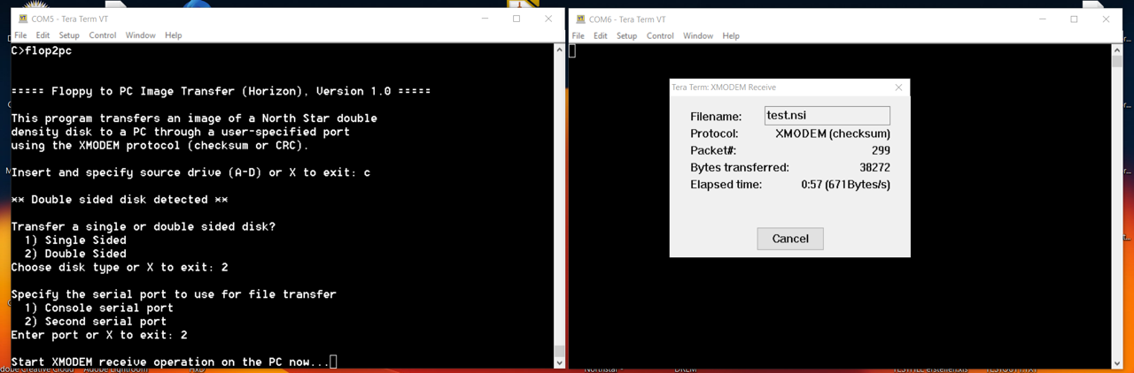 So I thought, why not use both ports? The first as the normal console and the second exclusively for file transfer with XMODEM. What can I say? It works. I use Windows 10 with two instances of TeraTerm. The connection is made via two USB serial cables and two Prolific PL2303GC USB to Serial Bridge Controller.