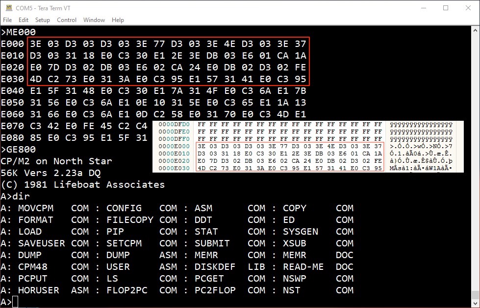 A monitor for the Horizon computer is present in the ROMs subdirectory of the Horizon folder. MON40C.ASM is the Vector Graphic monitor 4.0C ported to run on the Horizon computer. Because of the similarity between the hardware of the VG machines and the Horizon, very little modification of the VG monitor was required. The monitor offers memory examine, modification, breakpoints, an Intel hex file loader, memory test, memory search, and more. The “B”oot command has been modified to jump to the North Star boot ROM at E800 instead of the Micropolis boot ROM at F800.
