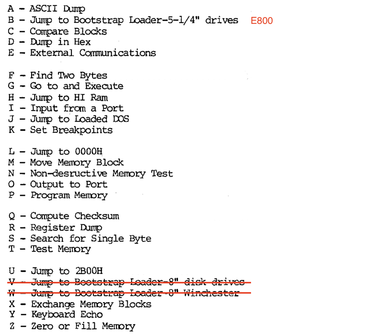 One of the most important commands is TEST (test memory)! Although I must note here that this test did not detect a bent pin on a RAM IC for me. Only by chance and a very close look I found the faulty pin, bent it back and everything was fine again.