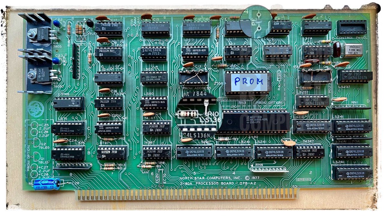 I have replaced the axial capacitor below left (16V, 100 µF) and the PROM regulators 79L05 and 78L12. Both regulators were not working properly. The PROM is configured to auto jump (POJ) address: E000; same as on my other ZPB-A2 boards. The floppy boot sequence (ROM) on the N* floppy controller is located at E800.