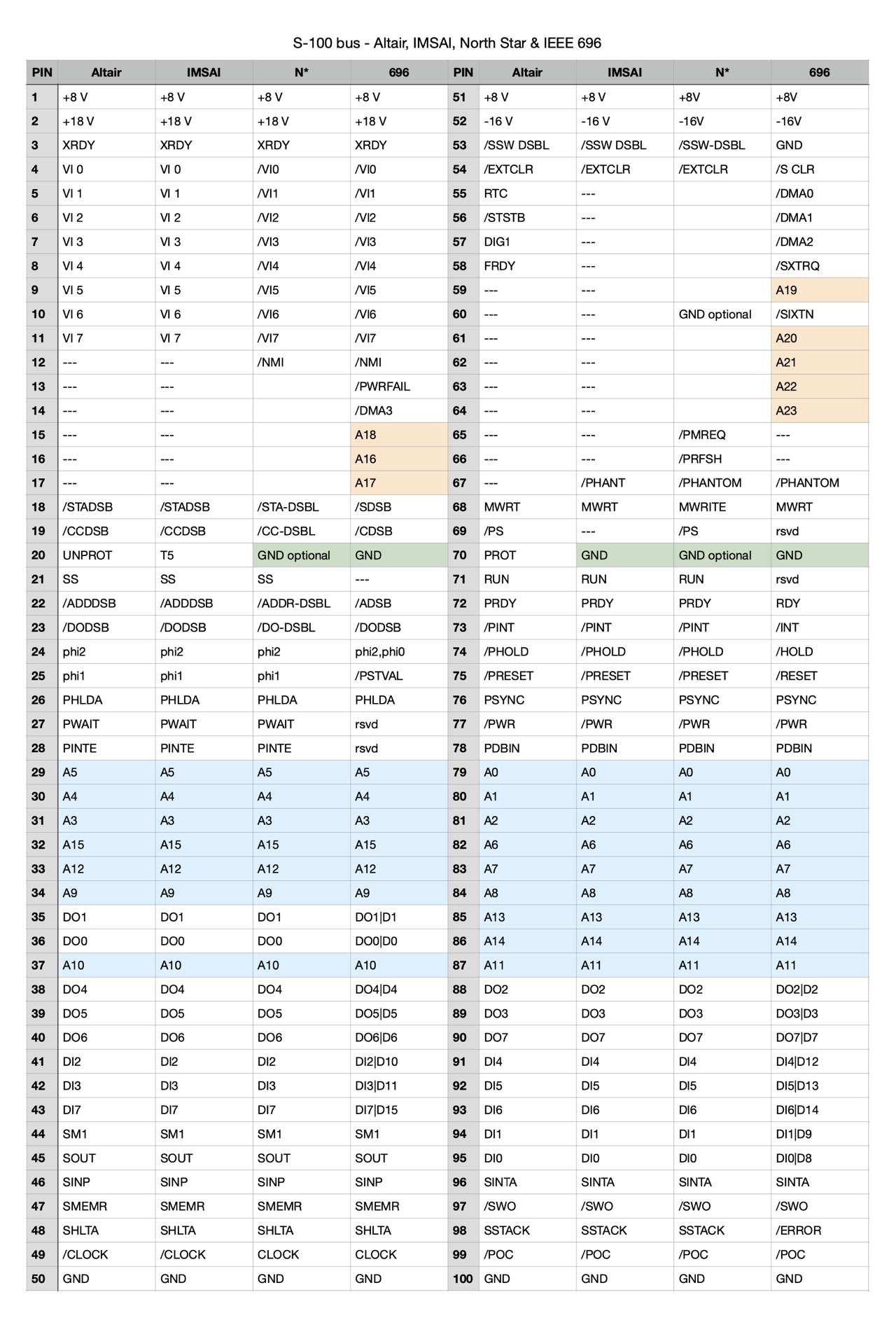 Unlike the later buses, the S-100 bus has evolved from the Altair to the IEEE 696 standard. In other words, S-100 is not always S-100! See below GND pins 20/70 and next!
