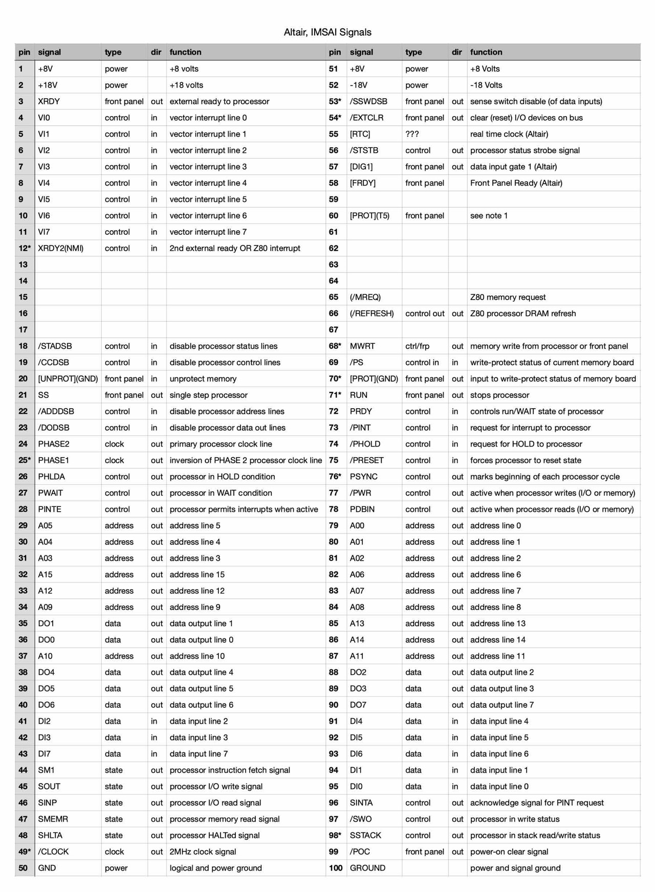 The chart below lists the "S-100 bus" signals for the Altair 8800(a), the IMSAI 8080 variations, and seperately the IEEE-696 lines. ... Active low signals are shown as "/". Unused lines are "---". Reserved lines are "rsvd". The first column are Altair 8800 and IMSAI 8080 signals; if the IMSAI signals are different they are in "()". The next column are the IEEE-696 signals. Signals 24 and 25 are named "phi" one and two. IEEE-696 signals separated by "|" represent the 8-bit and 16-bit data path signals, respectively, the latter enabled by the /SIXTN and /SXTRQ handshake. Note: Some S-100 or IEEE-696 systems may have +5V, +/-12V power, not +8 and +/-18. [1]